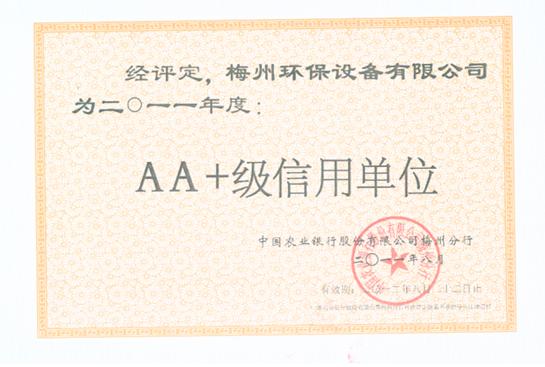 近日,我公司获得中国农业银行股份有限公司梅州分行颁发的“AA+级信用单位”证书。信用,是一个企业的根基,没有信用的企业终将会被客户和市场淘汰。梅州环保设备有限公司自成立以来,十分注重信用,把信用视为企业生存发展的生命要素。我们以真诚的态度,良好的信誉开展业务,与各单位合作愉快,得到了业界的认可和各级的好评。此次“AA+级信用单位”证书的颁发。